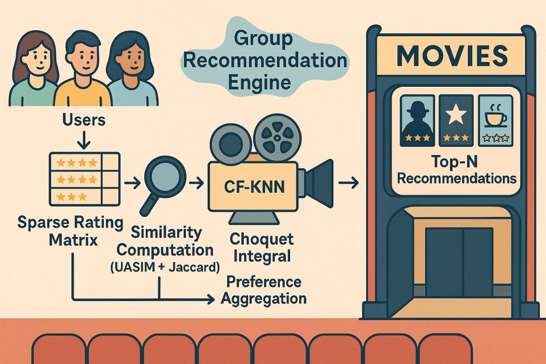 Nghiên cứu đề xuất một phương pháp mới kết hợp độ đo tương đồng Jaccard với tích phân mờ Choquet nhằm nâng cao hiệu quả của hệ tư vấn nhóm (Group Recommender Systems) trong điều kiện dữ liệu thưa, đây là một hướng nghiên cứu mang tính mới mẻ và có ý nghĩa thực tiễn cao, tập trung vào việc xử lý các thách thức của dữ liệu phản hồi tường minh thưa (sparse explicit feedback), vốn là vấn đề quan trọng trong các hệ thống gợi ý hiện đại. Phương pháp giúp cải thiện khả năng dự đoán chính xác sở thích người dùng, đồng thời đảm bảo sự công bằng và mức độ đồng thuận giữa các thành viên trong nhóm — những yếu tố then chốt để tăng trải nghiệm người dùng trong bối cảnh ra quyết định nhóm. Kết quả thực nghiệm cho thấy phương pháp này giúp cải thiện đáng kể độ chính xác, tính công bằng và mức độ hài lòng của người dùng so với các phương pháp truyền thống.